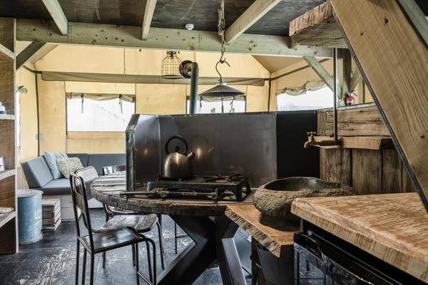 Next to the kitchen is the living room with ample seating and a wood-burning stove. The decoration and atmosphere is cool, robust and absolutely unique. Everything is custom made!